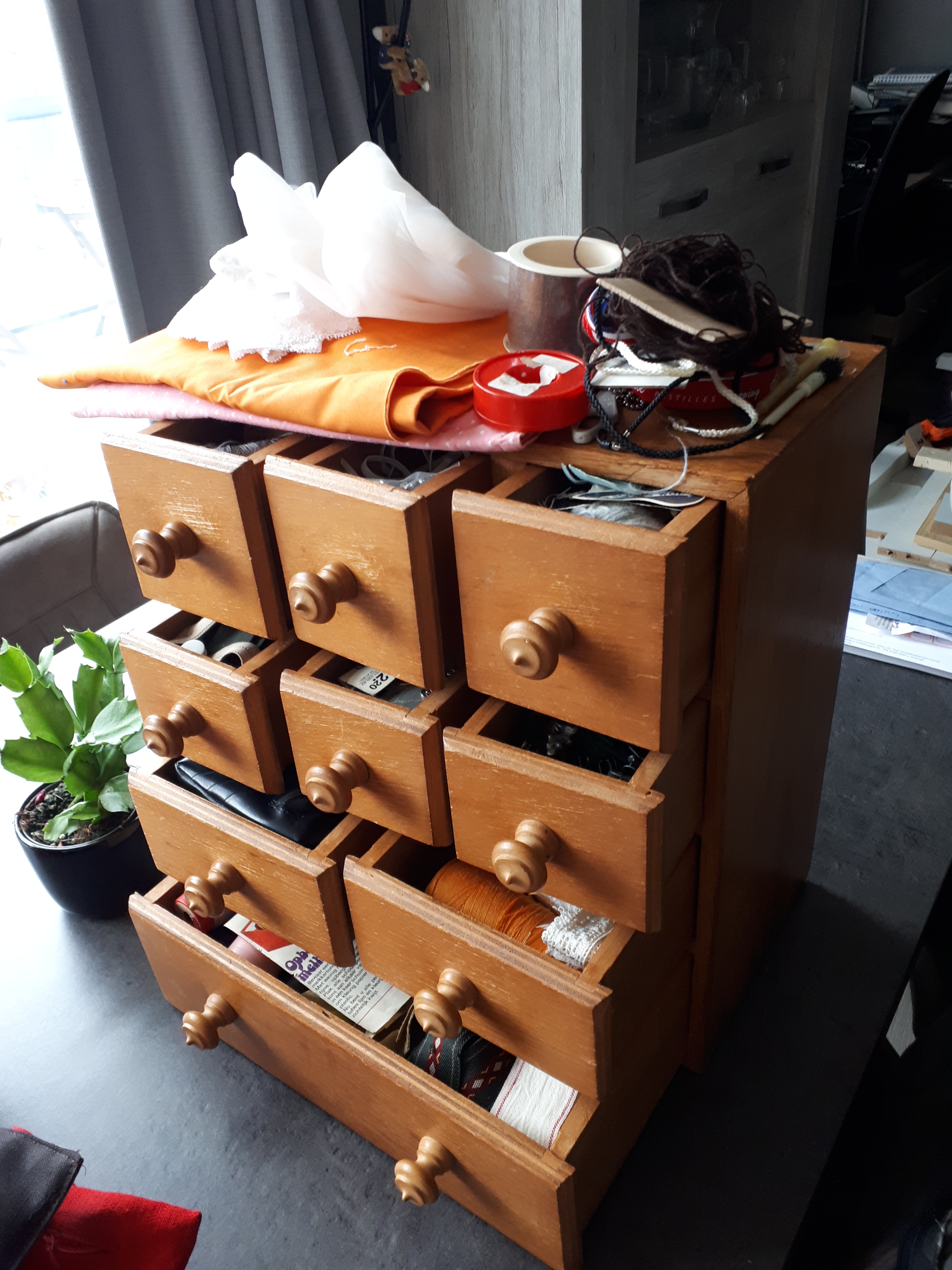 Ook haar vader, mijn oom dus, is zijn werkzame leven ook kleermaker geweest. Hij had een ladenkastje bij zijn dochter achtergelaten toen hij naar het zorghuis ging. 91 is hij nu. Hij wil de leeftijd van zijn broer, mijn paps, overleven. Paps werd 93.