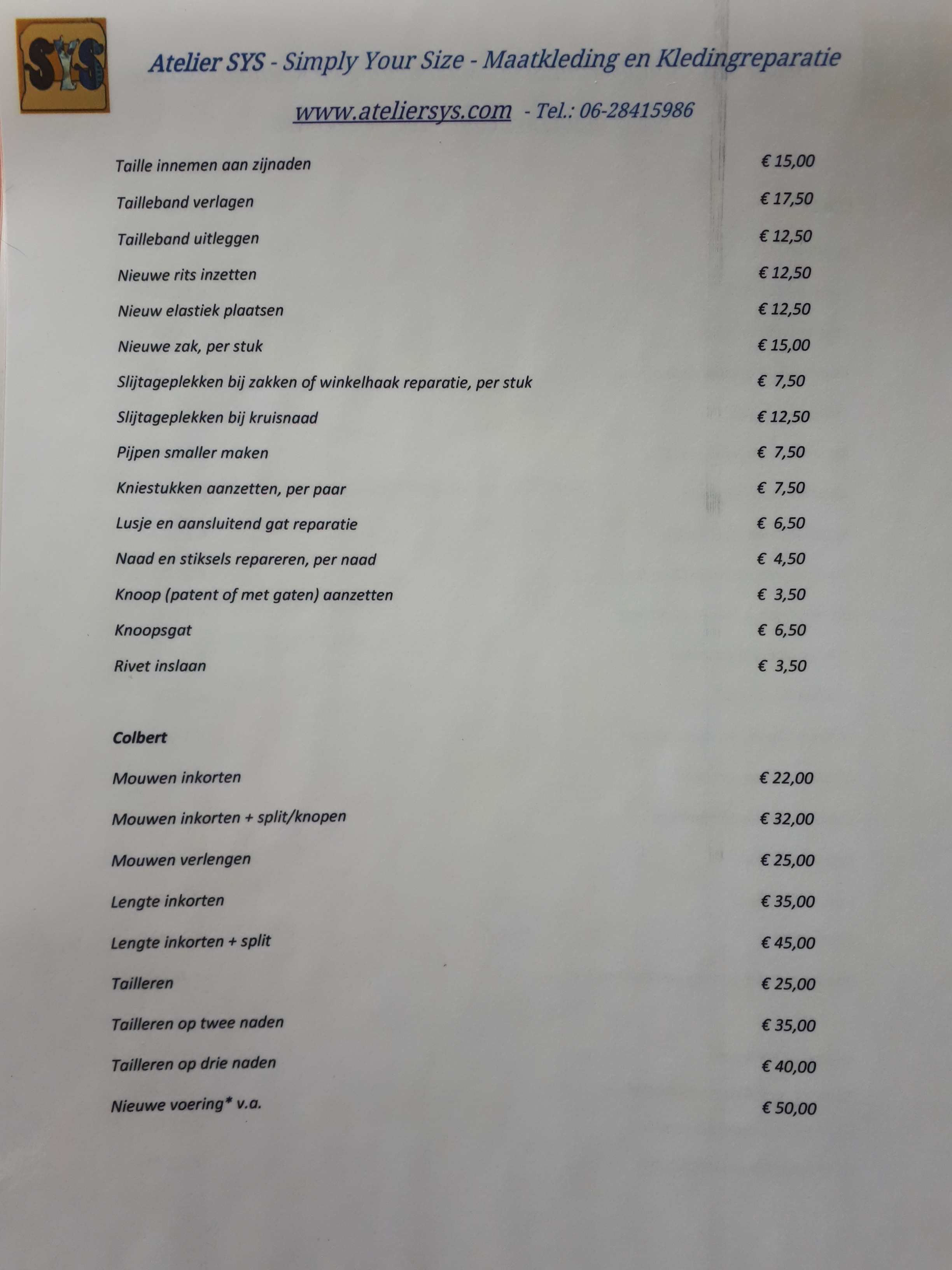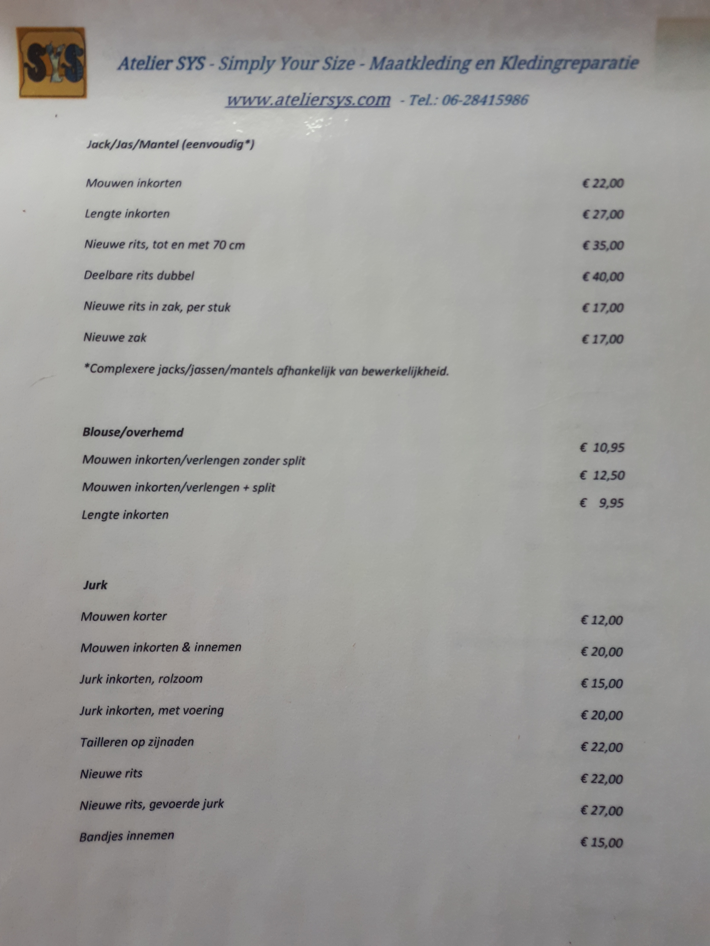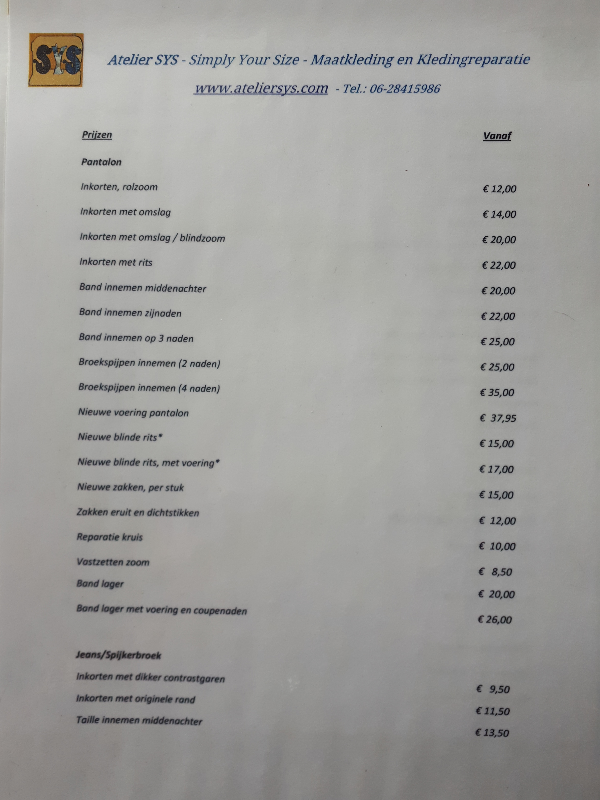 U vindt hier de prijslijst van Atelier SYS