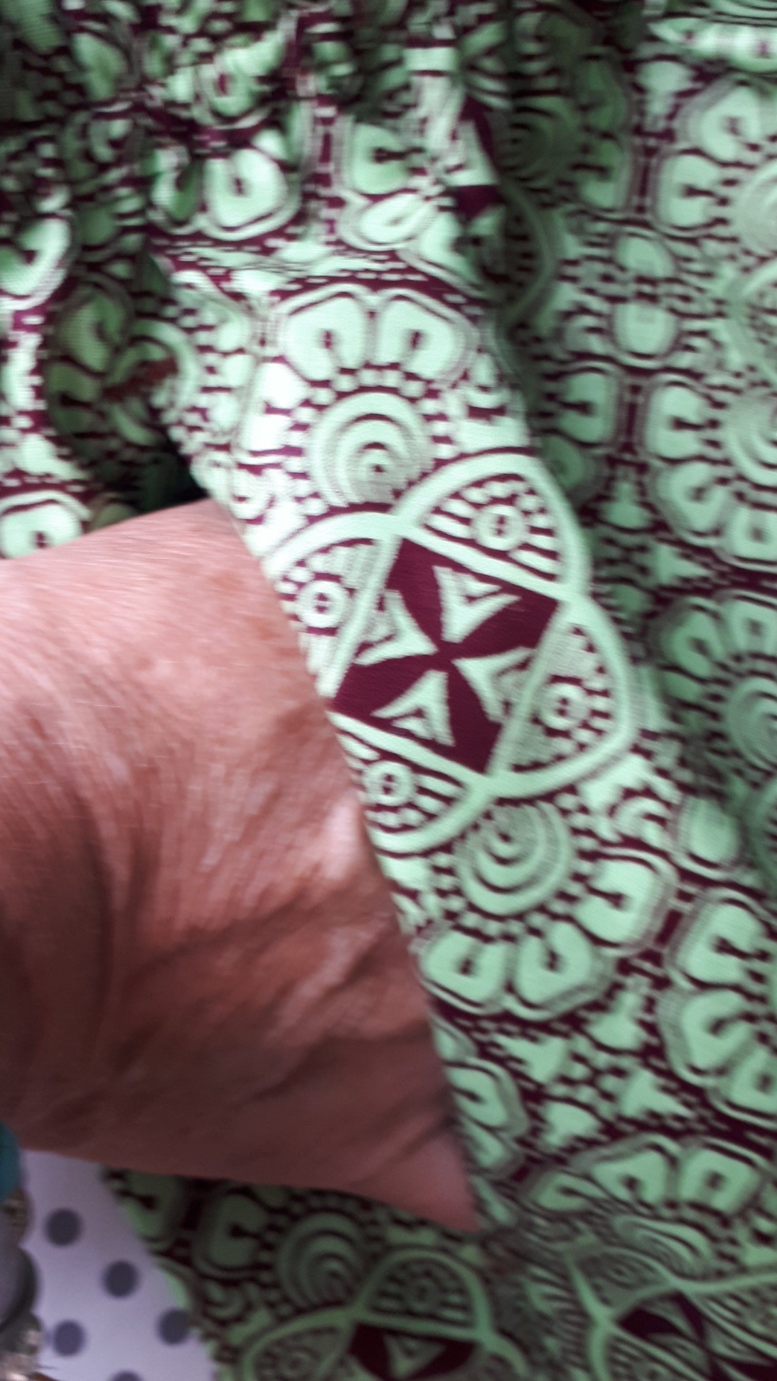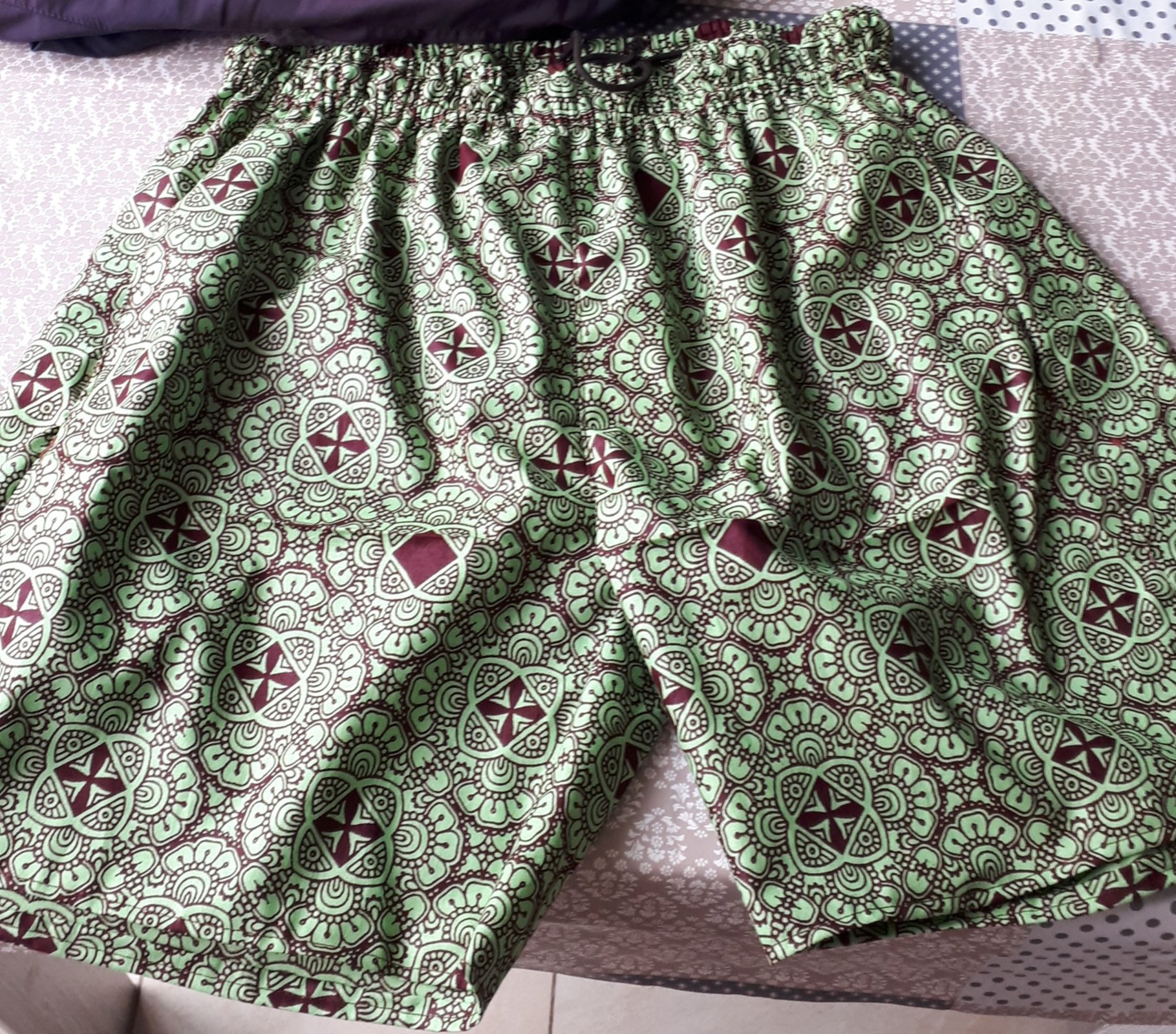 Van de Afrikaanse stof een ‘strandbroek’ vanaf patroon voor hem en een jurk voor haar, waarmee zij comfortabel kan zitten in haar rolstoel. Hier versprong het patroon, en net als bv bij behangen, moet je dit zo goed mogelijk aansluiten. Als het wat scheef gedrukt is, best een techniek!