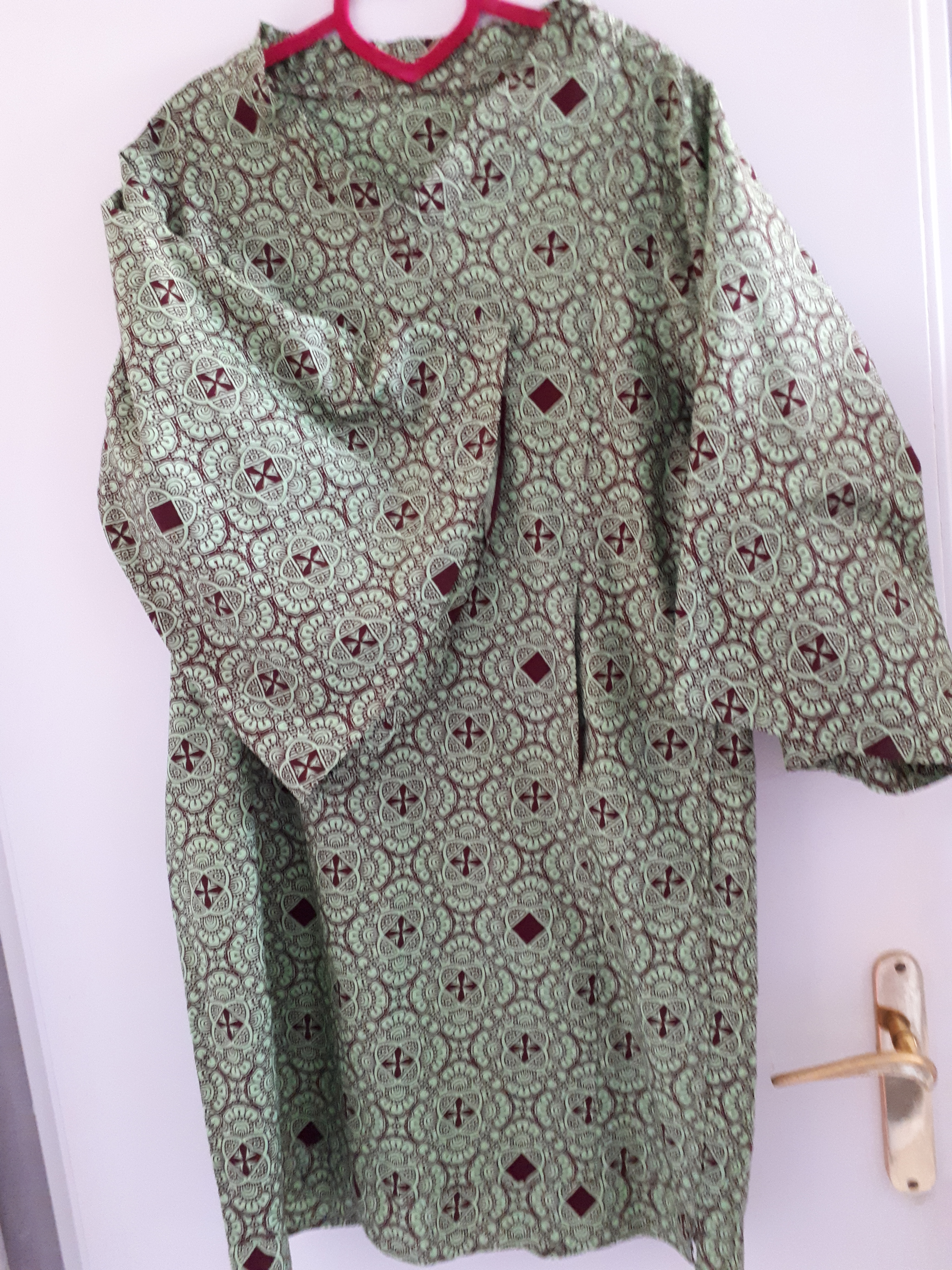 De opdracht: maak van een Afrikaanse stof, die klant al heeft, een jurk. Blijkt haar echtgenoot ook geen passende broek voor de bruiloft te hebben. De kleur van de lap stof komt terug in het werkje op zijn bloes. Dan maak ik er toch een strandbroek bij? Dat laatste is voltooid. Meteen het oude renbroekje maar even gerapareerd. Zakken en kruis én een pijp hadden losgeraakte stiksels). De jurk komt nog.